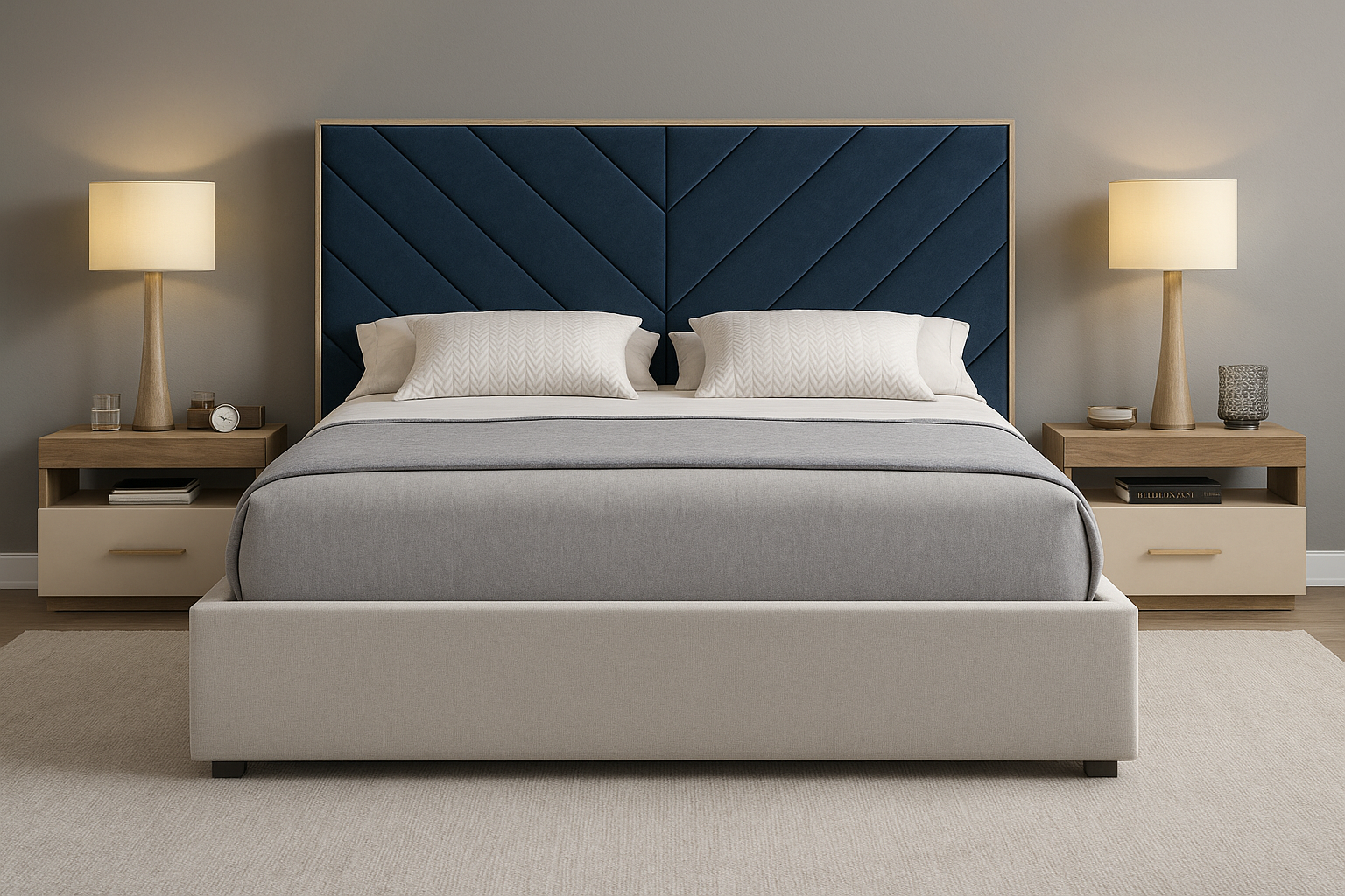 A clean, contemporary bedroom set featuring a deep azure/navy chevron‑pattern
