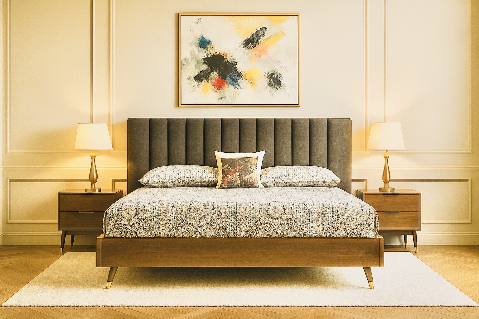 • Vertical channel headboard in charcoal fabric; slim floating walnut base