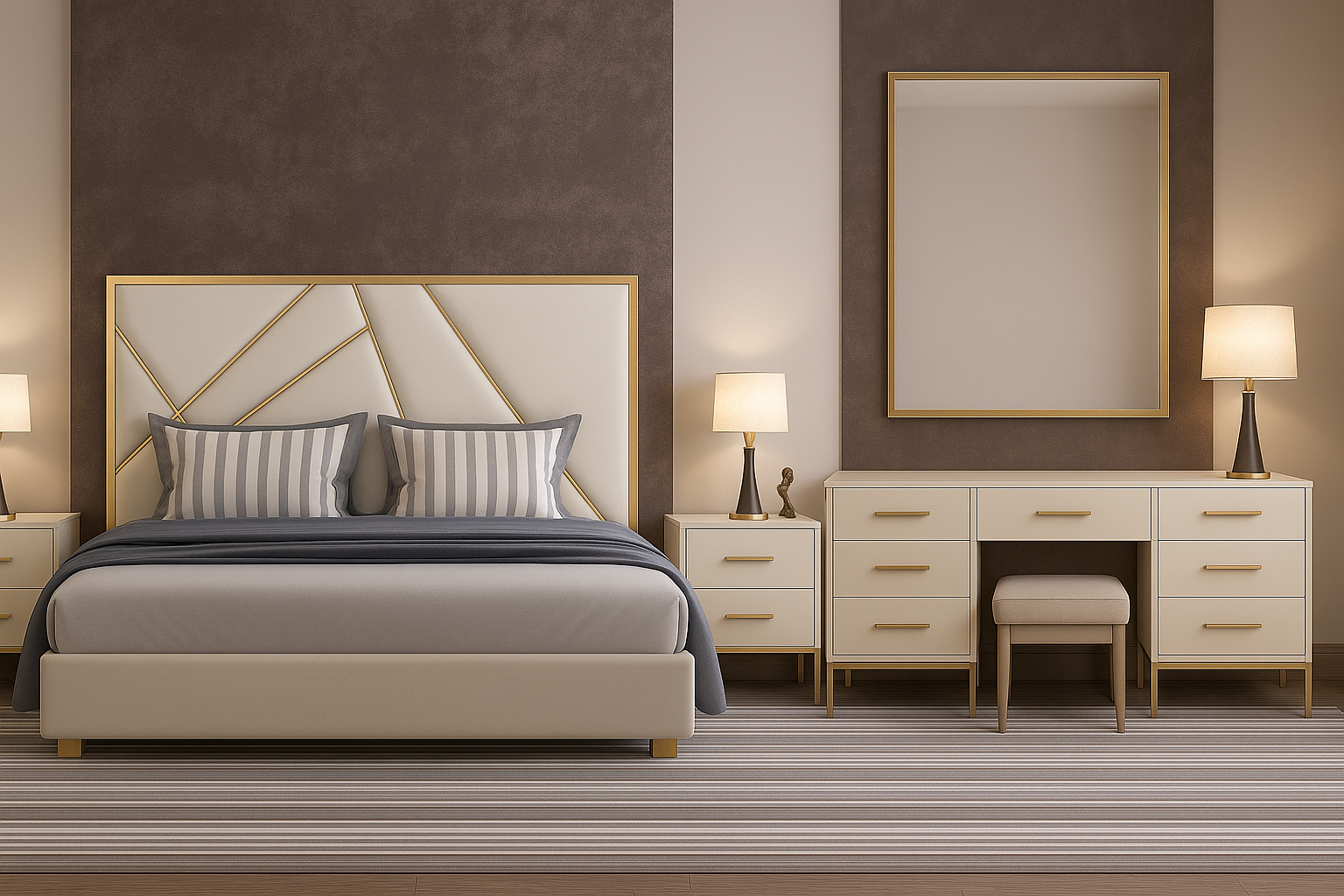 Contemporary luxury with striking gold accents and a geometric upholstered headboard.
