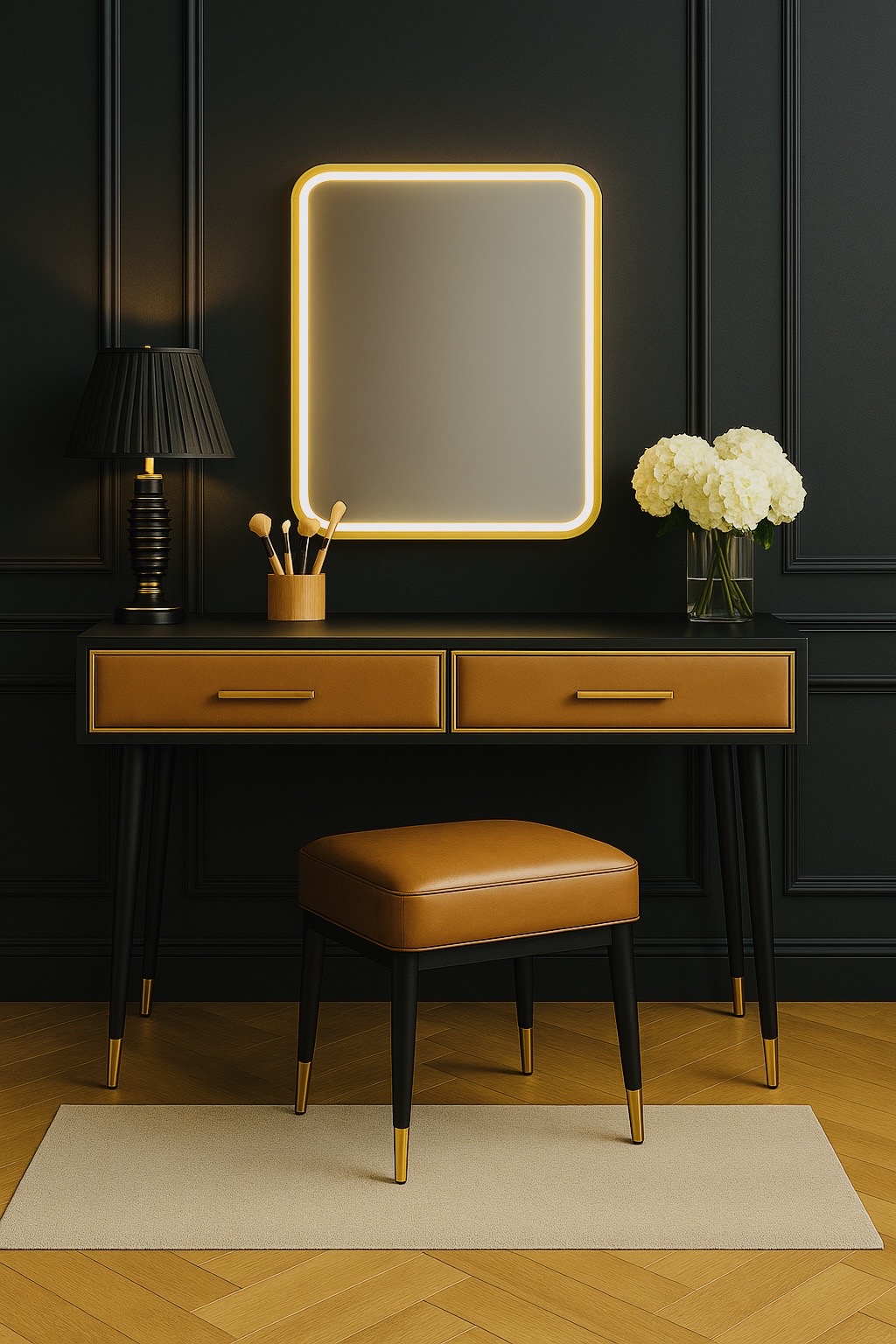 leather-look upholstery and deep charcoal accents create a luxe hotel vibe, while the