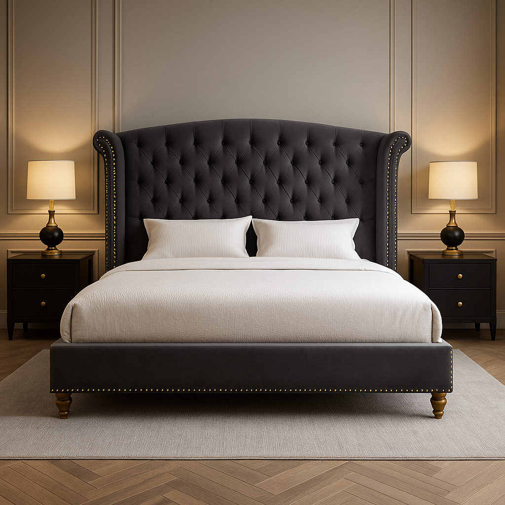 - King Size Bed (78″ x 72″) with wingback tufted headboard