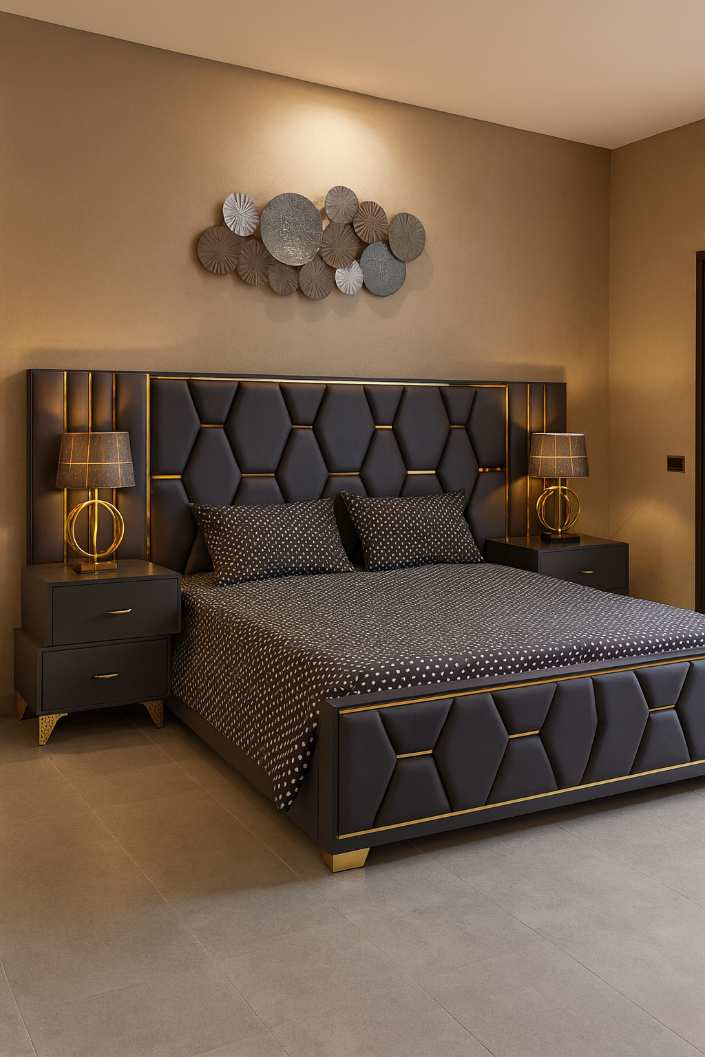 A bold, contemporary bedroom set featuring geometric hexagonal padded panels