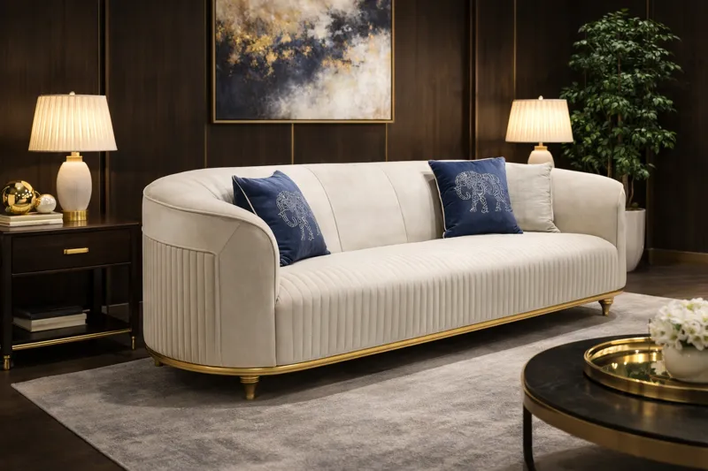 Transform your living space with this stunning cream curved 3 seater sofa, designed to bring modern luxury and elegance into your home. Featuring a smooth curved silhouette, vertical channel tufting, and a premium gold base, this sofa is a perfect statement piece for sophisticated interiors.