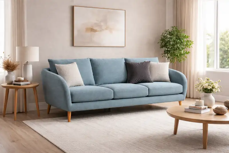 This sofa features a smooth curved armrest design with a balanced three-seater layout, offering both style and functionality. The soft blue tone adds a refreshing and calming feel to your interior, making it ideal for modern and minimal spaces.
