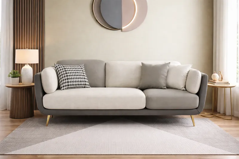 This sofa features a sleek modern structure with rounded side cushions, supportive backrest, and a balanced two tone color scheme that adds a premium designer look to any room. The soft neutral shades blend beautifully with modern, minimalist, and luxury interiors.