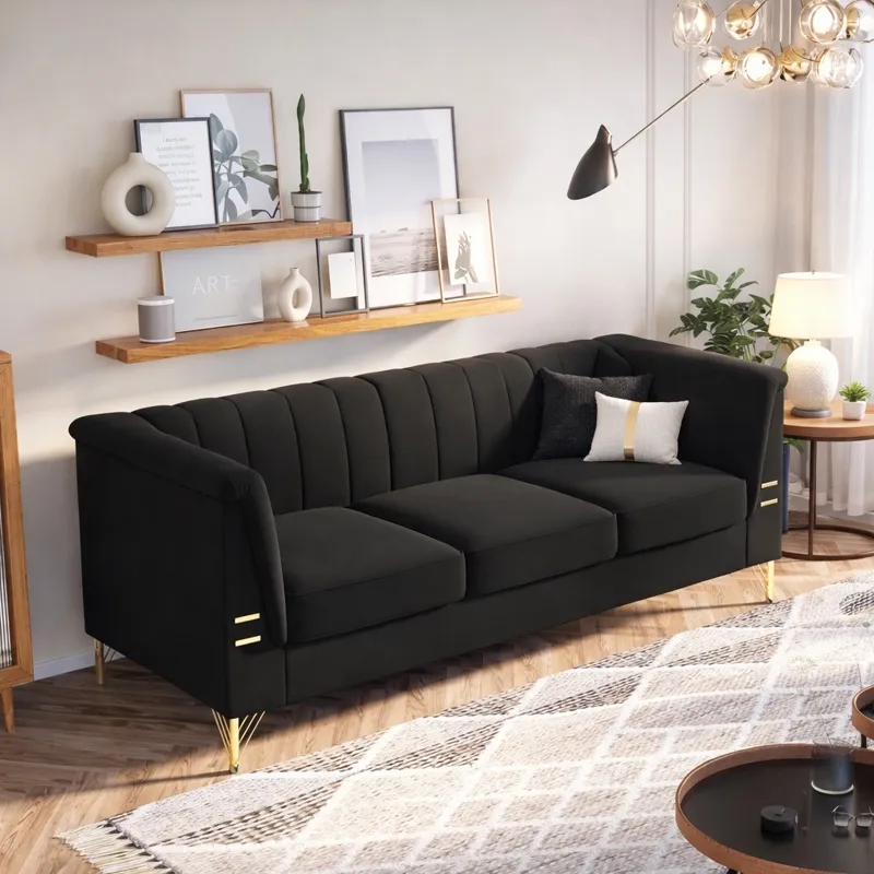 Add bold elegance and premium comfort to your home with this stylish black luxury sofa. Designed with a sleek modern silhouette, soft upholstered finish, and refined vertical channel detailing, this sofa is a perfect choice for contemporary and sophisticated interiors.