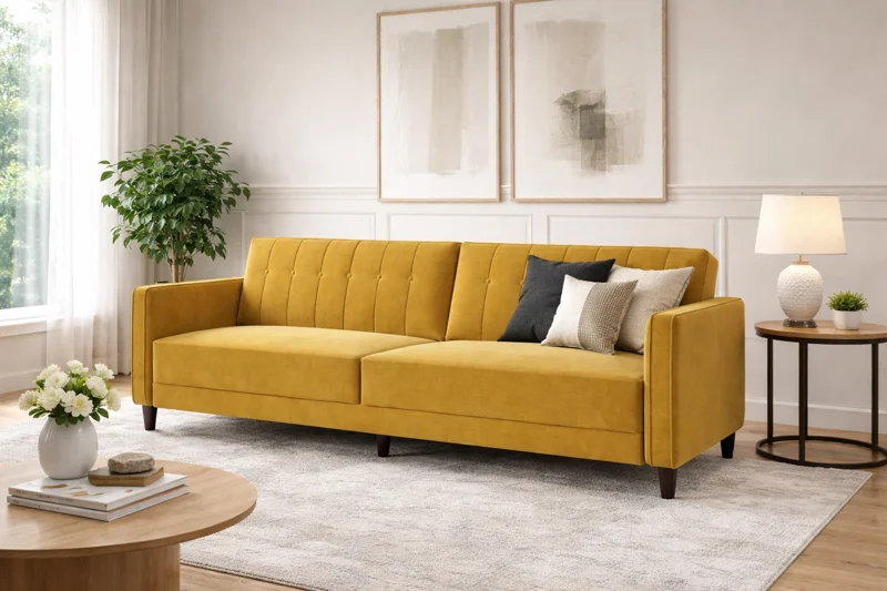 Enhance your living room with this stylish mustard yellow 3 seater sofa, designed to bring comfort, elegance, and a warm modern touch to your home. Its sleek structure, soft premium upholstery, and contemporary look make it a perfect choice for modern and luxury interiors.