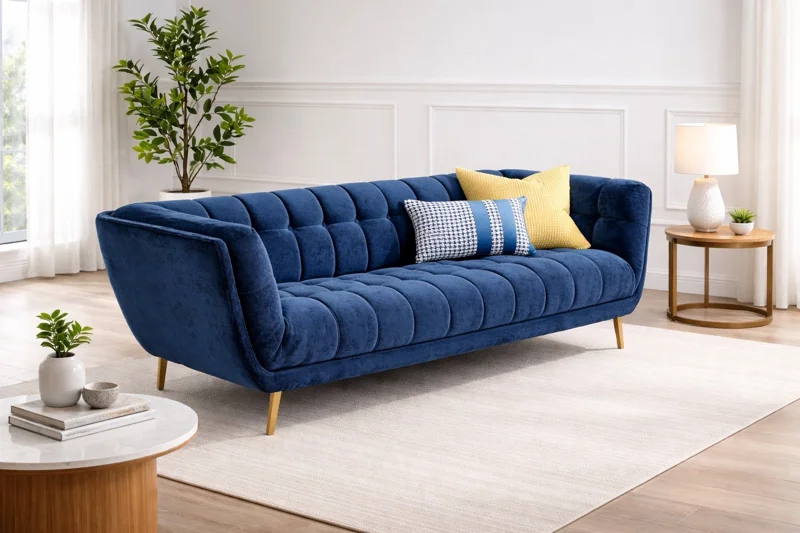 Upgrade your living space with this elegant blue velvet curved sofa, designed to add comfort, sophistication, and a premium modern look to your home. Featuring deep channel tufting, a stylish curved silhouette, and luxurious velvet upholstery, this sofa becomes a perfect statement piece for contemporary interiors.
