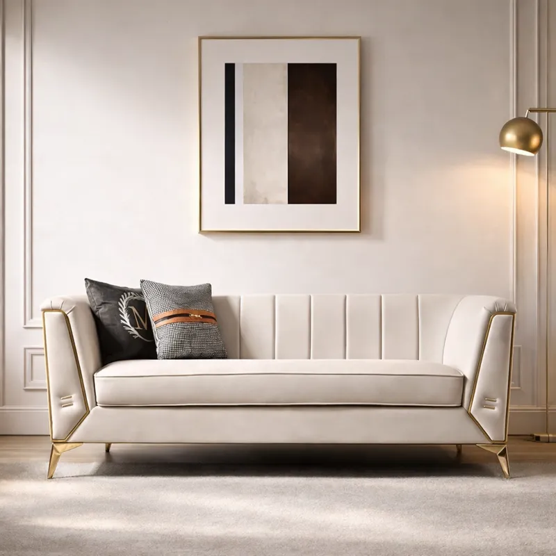 Enhance your living space with this stunning off-white luxury sofa, designed to bring elegance, comfort, and a modern aesthetic into your home. With its sleek structure, soft upholstery, and refined gold accents, this sofa is a perfect blend of style and functionality.