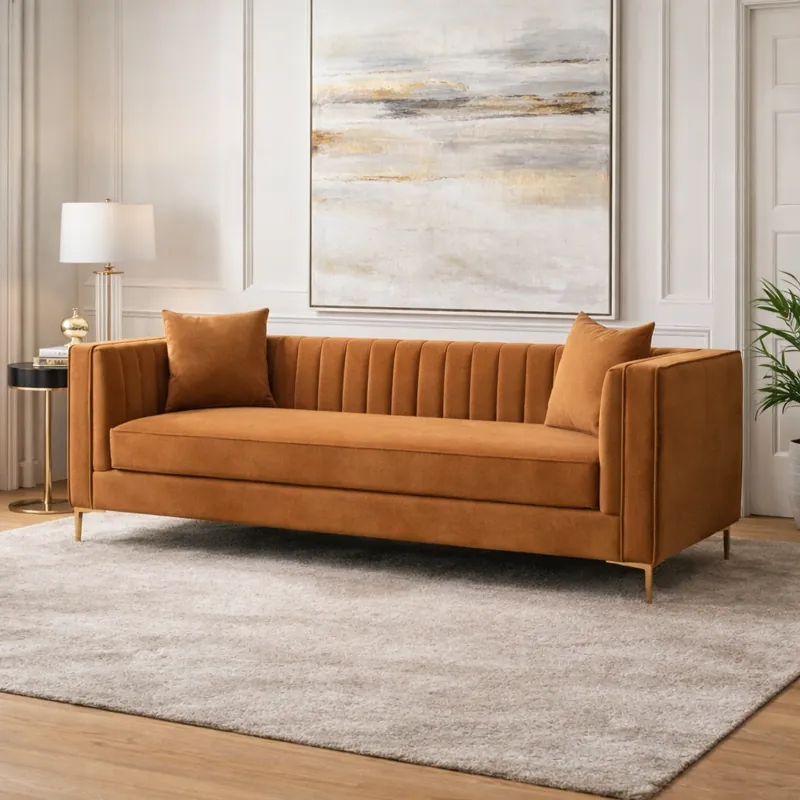 This sofa features a sleek rectangular frame with vertical channel detailing on the inner arms and backrest, creating a sophisticated and premium look. The warm brown tone blends beautifully with both neutral and luxury décor themes.