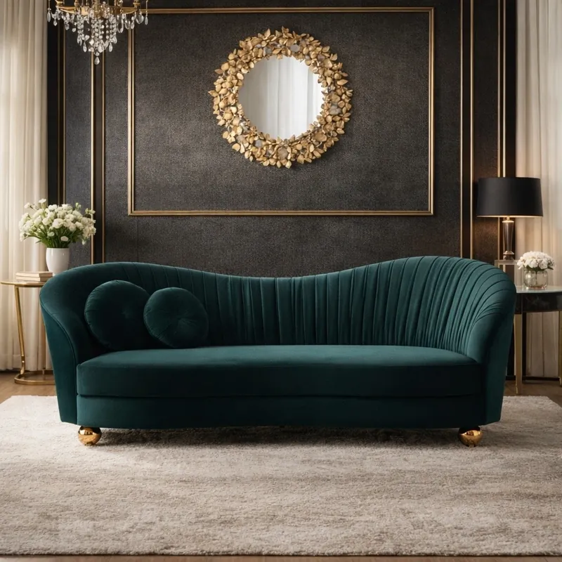 Bring elegance and sophistication into your living space with this beautifully designed green velvet curved sofa. Featuring a soft premium finish, elegant pleated backrest, and a luxurious curved silhouette, this sofa creates a bold statement for modern and high-end interiors.