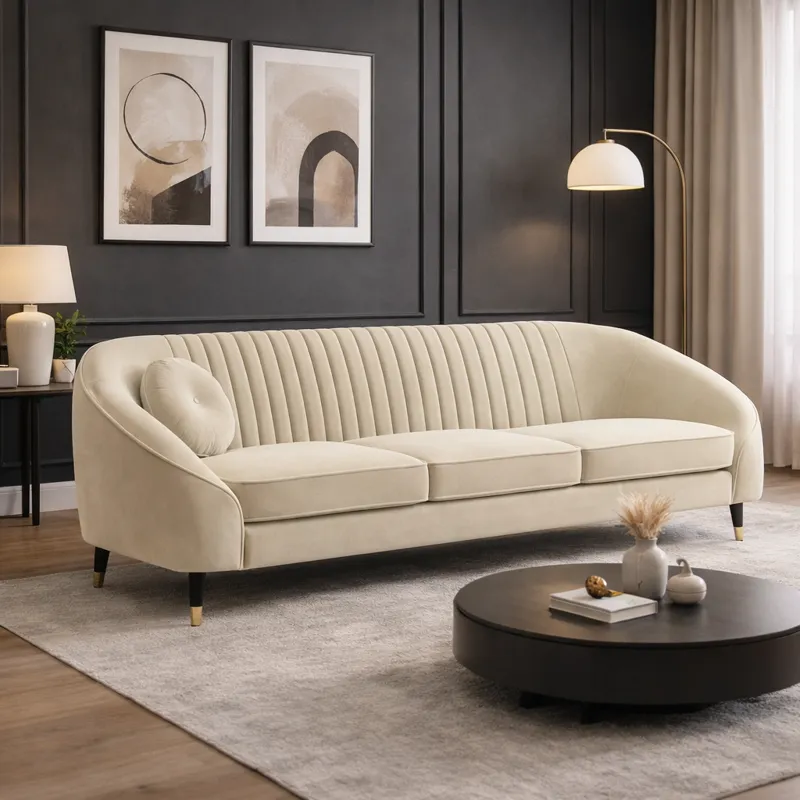 This sofa features a stylish curved back with vertical channel tufting, giving it a premium designer look. The elegant cream color adds warmth and blends beautifully with modern, minimal, and luxury home décor.