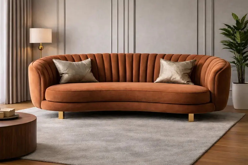 Transform your living space with our Luxury Rust Velvet Sofa, designed to make a statement with its rich color, curved silhouette, and refined vertical channel detailing. This sofa brings together modern luxury and everyday comfort, making it a perfect choice for stylish interiors.