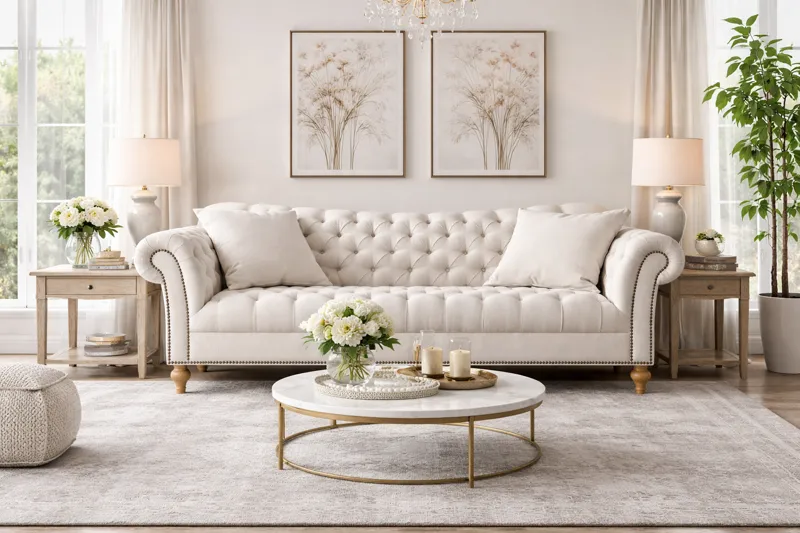 This sofa features a traditional Chesterfield silhouette with deep button tufted detailing and gracefully rolled arms. The clean cream color enhances its luxurious and sophisticated appearance.