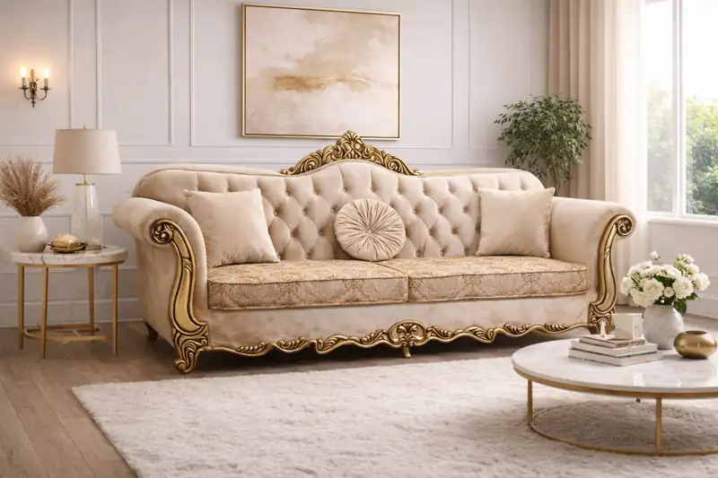 This sofa features an elegant curved silhouette with detailed hand-carved golden accents on the arms and base. The deep button tufted back and decorative crown-style top design add a grand and sophisticated look to your living space.
