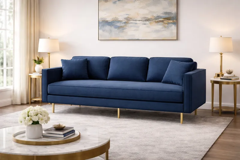 This sofa features a straight-line structure with a minimalist profile, giving it a clean and refined appearance. The rich navy blue color adds depth and sophistication to your living room.