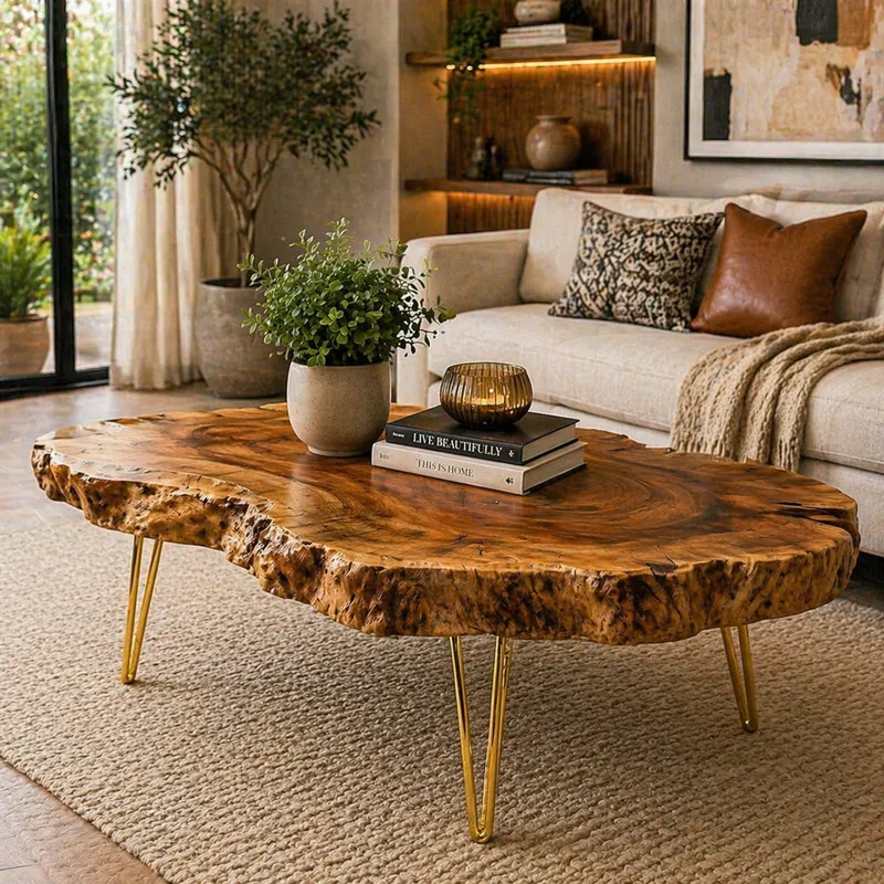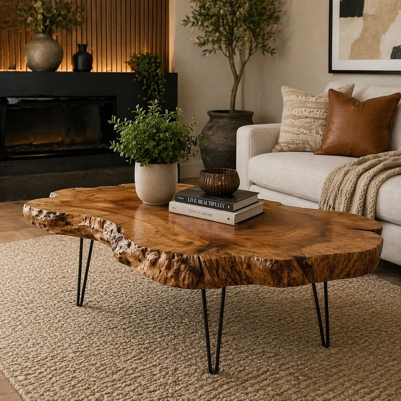 Bring a natural and artistic touch to your living space with this beautifully crafted live edge coffee table. Featuring a solid wood slab with organic curves and sleek metal legs, this table blends rustic charm with modern elegance.