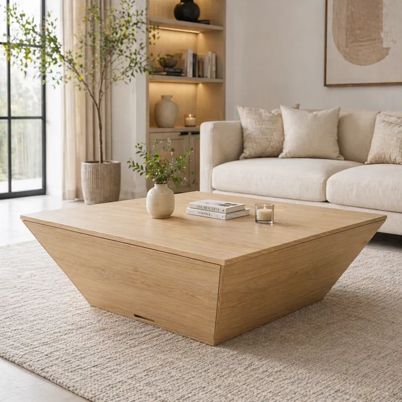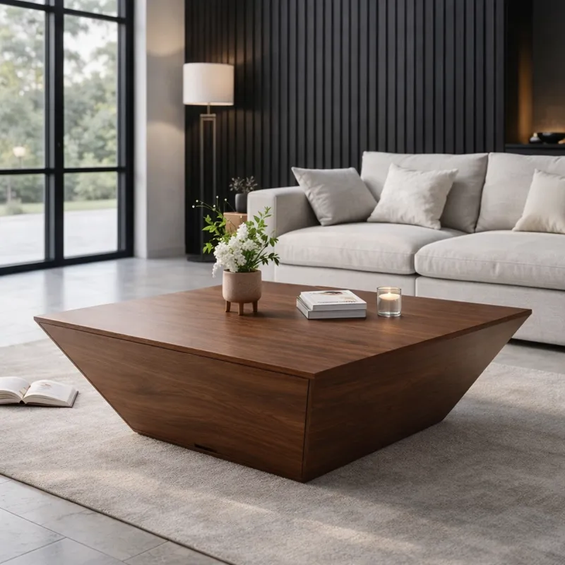 Designed with a distinctive sloped base and clean square top, this coffee table stands out with its modern architectural form. The bold structure adds depth and character, making it ideal for statement living rooms.