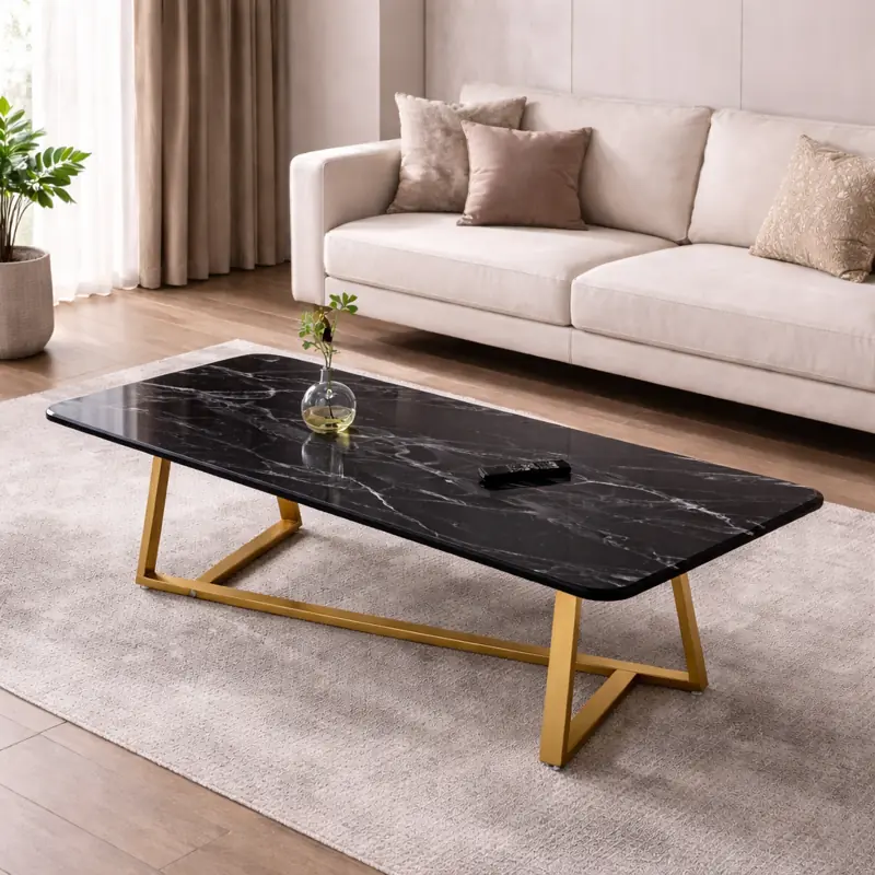 The combination of deep black marble and elegant gold legs gives this coffee table a high-end, designer look. Its minimalist rectangular shape blends beautifully with modern, contemporary, and luxury interiors.