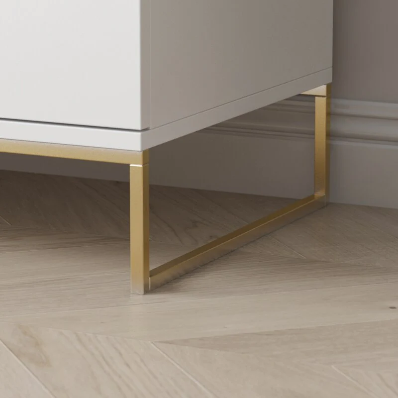 - Its manufactured wood frame and metal leg feature two large cabinets with adjustable shelving and three full-extension drawers on ball-bearing glides