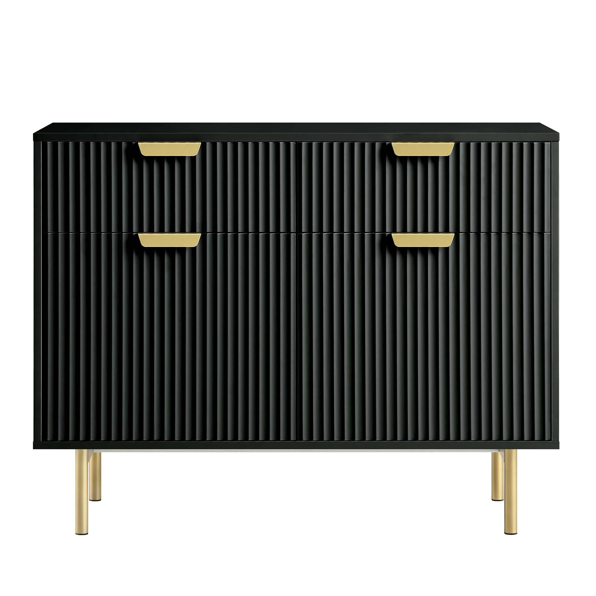 - The cabinet features a ridged surface on the doors and drawer fronts, finished in matte black paint